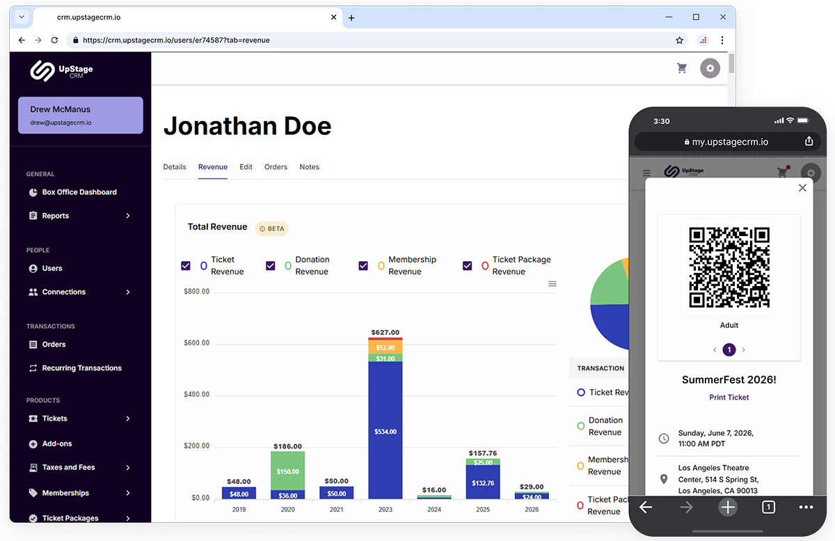 Your patrons are used to buying experiences at Amazon, Google, and Apple. So why settle for a system that gives them anything less? UpStage delivers a seamless experience for ticket buyers and donors, while providing you with unparalleled support. It’s a win-win performance that keeps your audience coming back for encores.