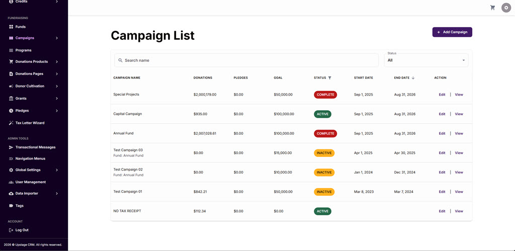 Yes. UpStage includes native grant tracking and pledge tracking. Campaigns track goals and revenue in real time. Individual pledges attach directly to campaigns and appear in revenue reports. For organizations currently running development operations across Salesforce, spreadsheets, and disconnected ticketing data, a consolidated platform is not a convenience; it is a fundamental change in how your team works.