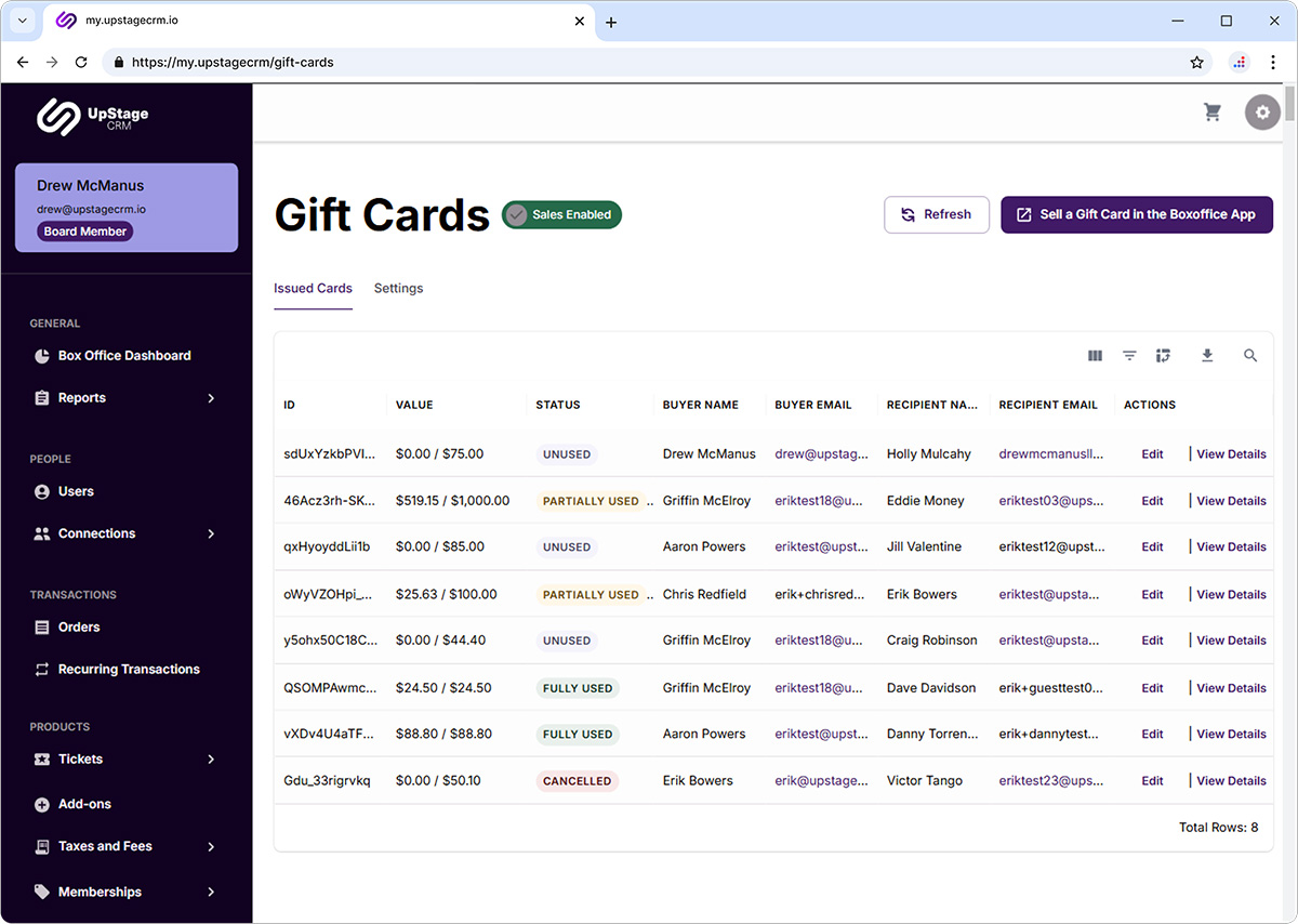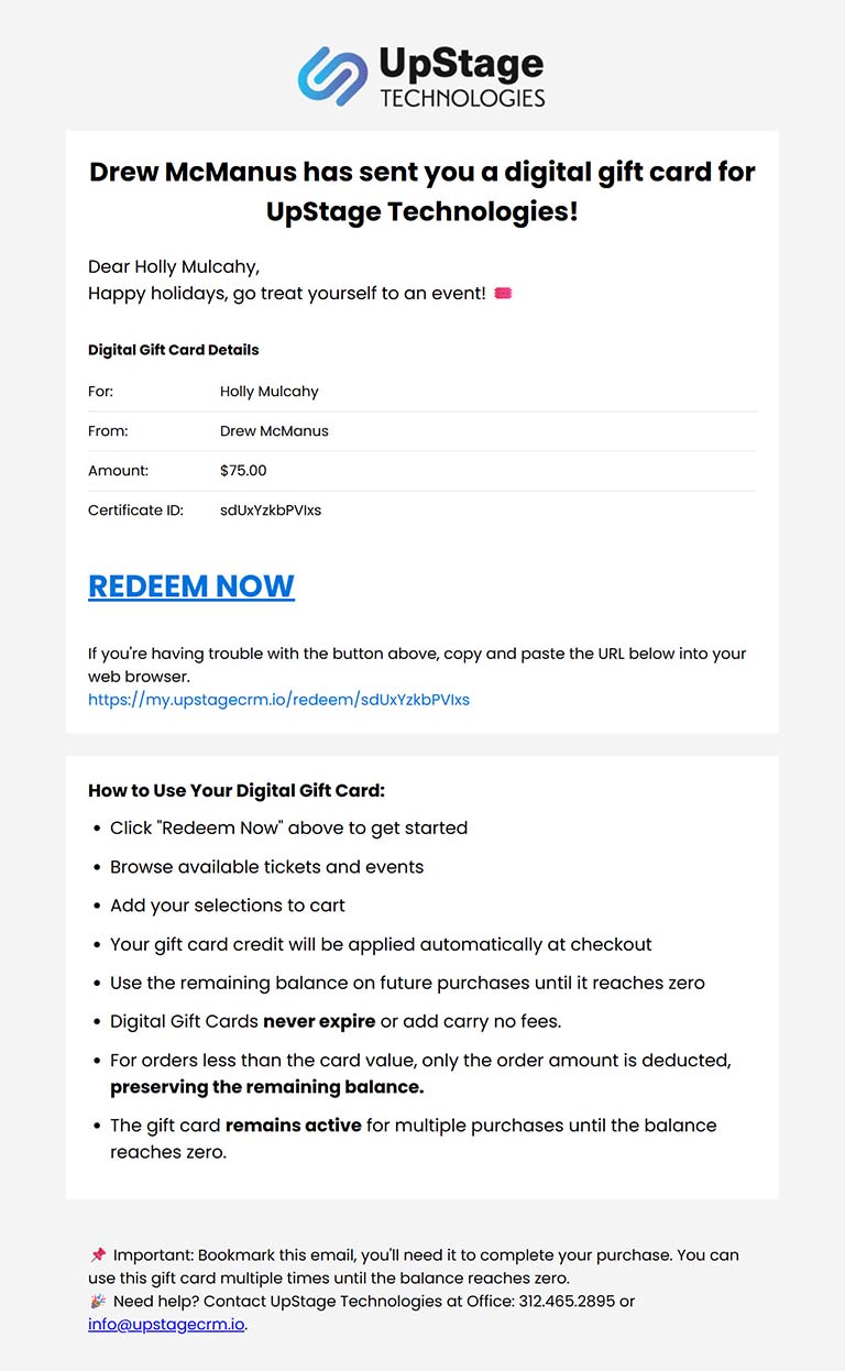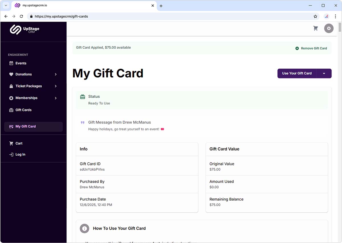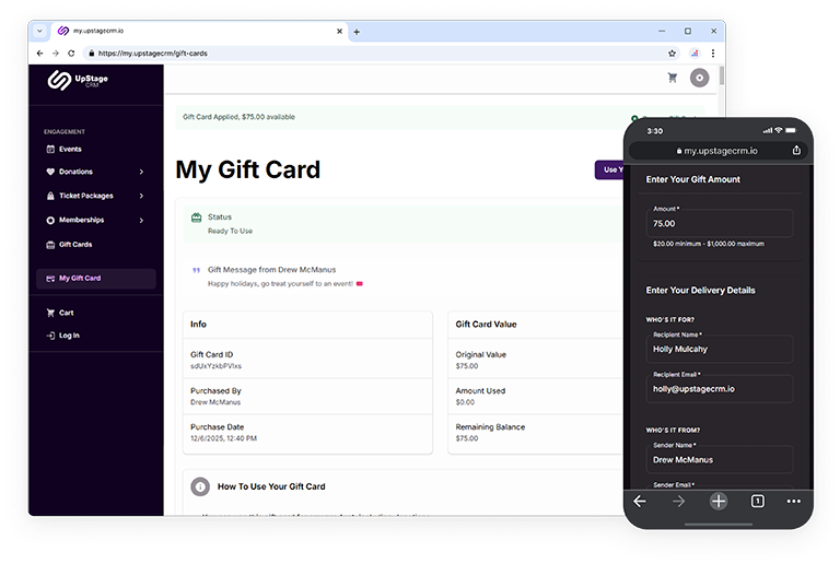 Transform experiences into unforgettable gifts. UpStage’s digital gift cards make it effortless to give tickets, memberships, and donations with zero friction for buyers, recipients, or your team.